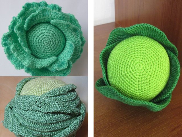 The first leaf is ready! We knit 5 more leaves in a similar pattern. Then we fix the leaves to the cabbage. The cabbage is ready!