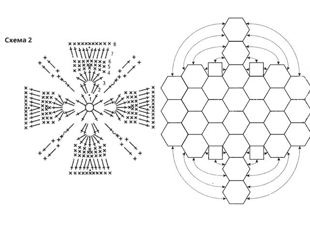 To make half our hexagonjust use Scheme 2. When the first row is finished - do the rows in the forward and reverse directions. 1 - 7 R. to do, alternating the colors of the thread. In order for the bag to ultimately be obtained, 15 motives will be needed. They will need to be sewn together for the back wall of the loops.