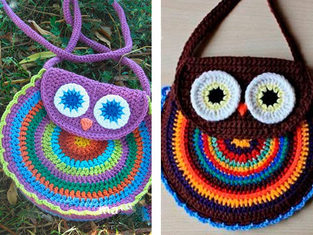 Handbag for a little girl crocheted according to the scheme below, also, there is a description of the process. The scheme is a very simple pattern, the "owl" is very easy to execute. It can be connected both in the summer and at any other time of the year. It will be very useful for children - they just love animals! Find beautiful bright knitting threads so that the pattern can look good. Bottom we make according to the scheme below, the product itself with the help of S.S.N., stomach – S.B.N., we tie 1 S.B.N., 5 S.S.N. in one base. Eyes and nose in amigurumi ring - 6 S.B.N., 12 S.B.N. (2 S. B.N. in each P. of the first R.). We knit further as many R. as needed for a beautiful beak. You can fill with filler to add volume.
