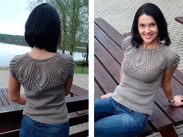 To assemble a beautifully feminine top - side, shoulder seams, we tie around the perimeter. This option is more suitable for beginners, photos with diagrams and a description of how to connect are very helpful in the work. You can make a milky top with a leaf pattern, but it is better to refrain from having it with an open back.