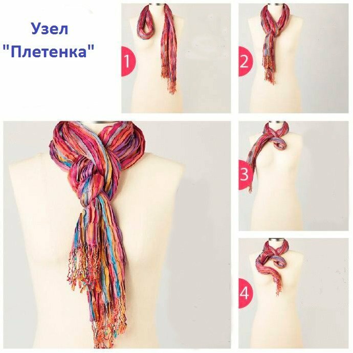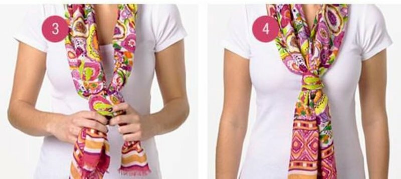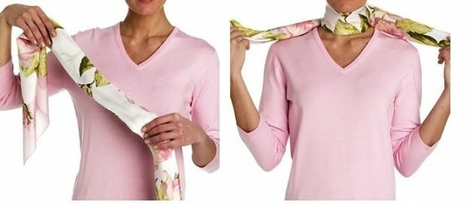 This method of tying a scarf is suitable for the cool and warm season. It emphasizes the beauty of the female image and is suitable for any type of clothing.