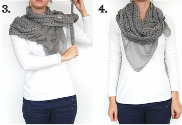 Step 3 and 4. Re-tie the knot for better fastening. Twist the two sides of the scarf and get a loop.