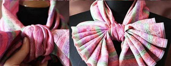 Such a knot, the image of the girl will become even more feminine. A neck scarf tied in the shape of a bow is suitable for autumn and spring. You can use the accessory for both formal and romantic meetings.