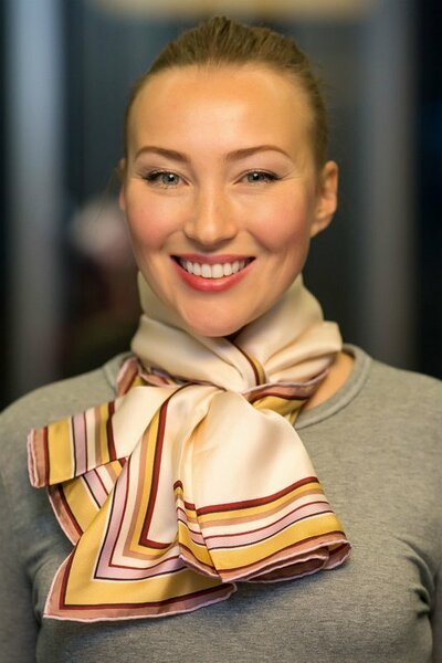 You can tie the scarf with the “Coquette” knot using the step-by-step instructions.