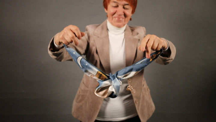 For work on the technique, it is recommended to use a small square scarf. The material of the accessory can be satin or silk fabric.