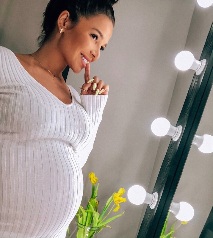 Of course, Katya could not ignore the most fashionable dress for pregnant women of recent years. And this tight-fitting midi knit dress.