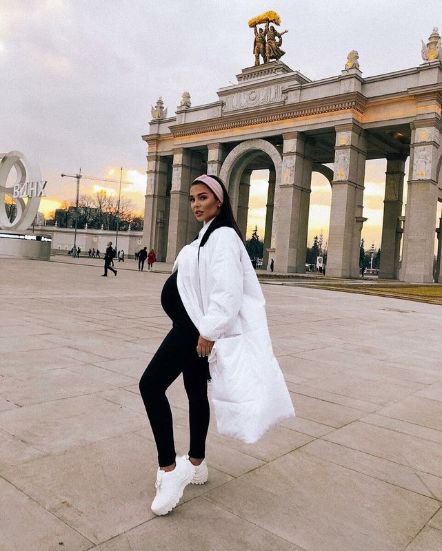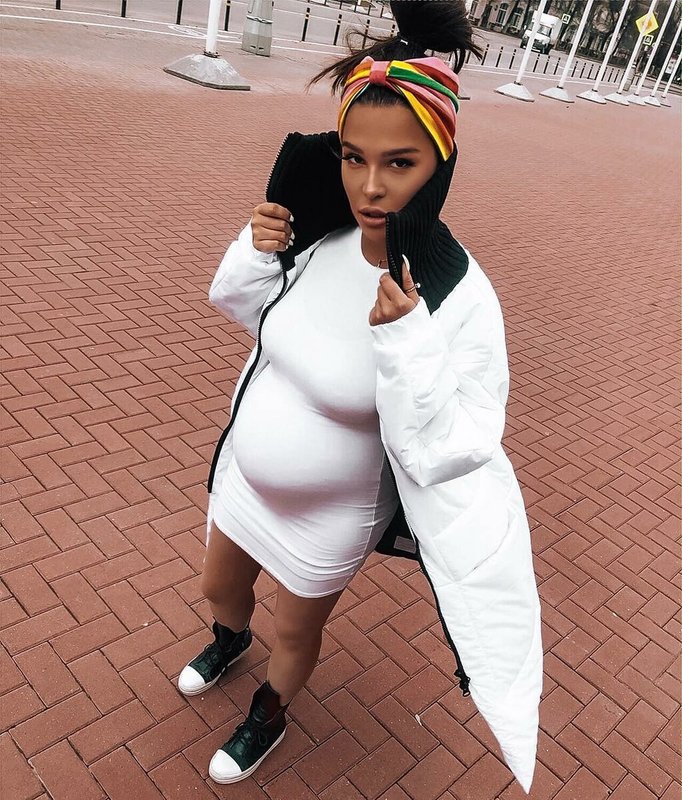 A white down jacket and white massive sneakers paired with leggings and a turtleneck are a great solution for a pregnant girl: stylish and comfortable. A headband will protect from the cold no worse than a hat.