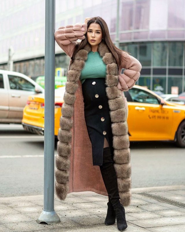 You can complement the kit with an elongated coat, fur coat, or a warm cardigan with fur. Short outerwear for this image will not work.