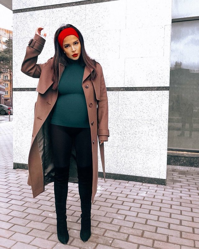 Studs, of course, are not the most comfortable shoes for a pregnant woman, but recently, our and Western celebrities, for some reason, choose such shoes, being in an interesting position. Paired with a trench, boots, of course, look harmonious. A bright accent in the form of a red bandage and lipstick perfectly completes the image.
