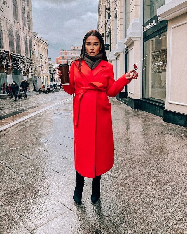 During pregnancy, do not give up bright things. It's time to buy the red coat that you have been dreaming about for so long. You can combine it with a scarf in brown, blue, olive or black. One bright accent in the image is enough.