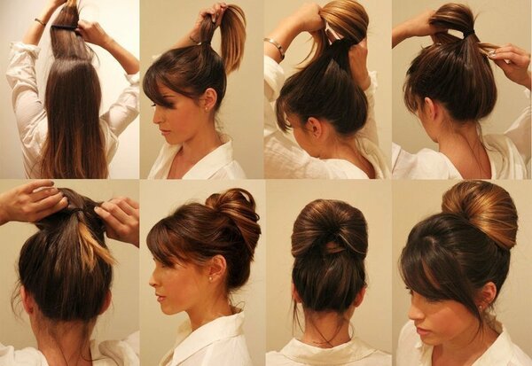 Long hair is combed and untangled from the bundles. Then the curls gather in a short tail. Using your fingers or a loop, thread the end of the tail into the hole between the head and the elastic. Initially, the rubber should not be tightened too much - this is intended for the convenience of work. We comb the bangs and give it the finished shape with our hands.