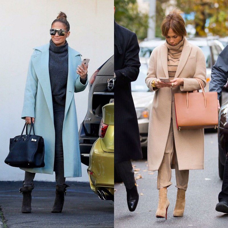 Jennifer Lopez often wears a P-coat. This style perfectly allows you to stretch the silhouette. The coat covers the hips and slightly increases the shoulders, making the image more proportional.