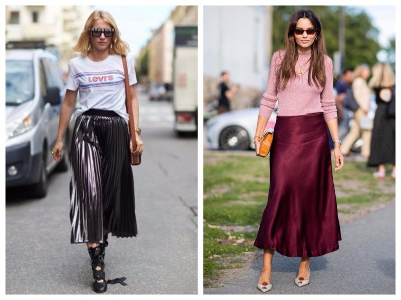 Silk skirt below the knee is quite a universal thing. She harmoniously looks with low shoes - sandals with straps and flip flops. Fashionista sneakers and sneakers rarely wear shoes under such skirts.