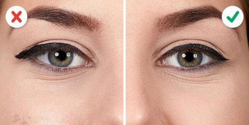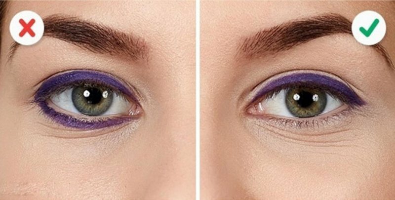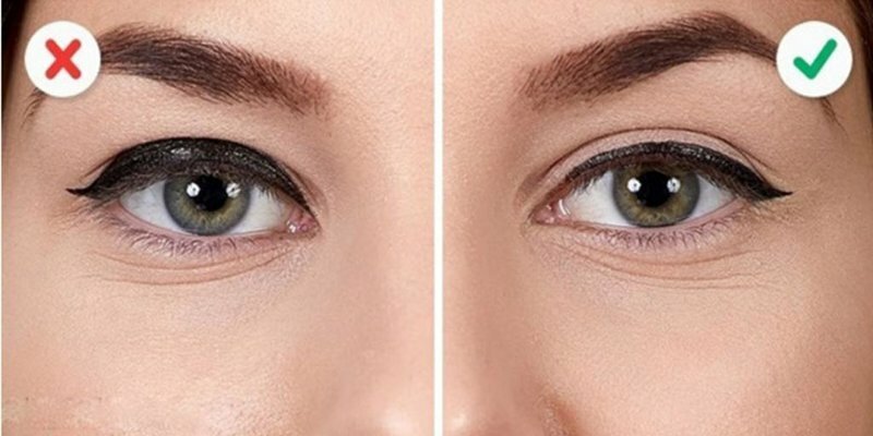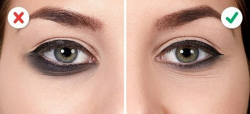 Eyeliner fluid texture on the lower eyelid. Due to the liquid consistency, the eyeliner will begin to drain off and smear under the eyes, which will create the effect of bruises and bags under the eyes. Therefore, remember that liquid eyeliner is used only for drawing arrows on the upper eyelid. If your eye shape requires underlining, use a soft pencil.