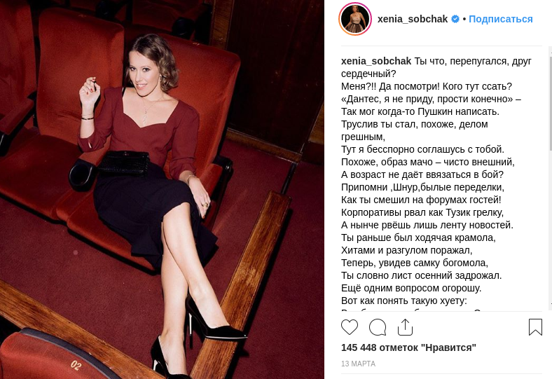 Well, the first confirmation of the novel by Ksenia and Bogomolov was not even a joint publication, but verses that the star blonde devoted to Sergei Shnurov. There she called herself a “female praying mantis”, which clearly pleased the fans who watched the “intelligent” skirmish on the net.