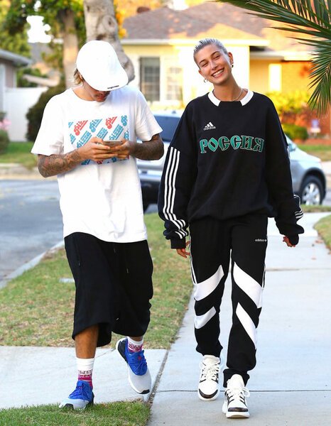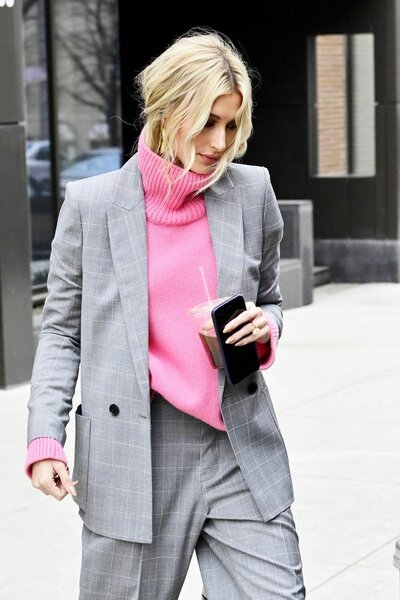 Justin Bieber’s wife is still a beauty: long thin legs, wasp waist. With such a physique, only dresses and wear. And she chooses huge pantsuits in which the shoulders are like a swimmer, and her legs look short and full.
