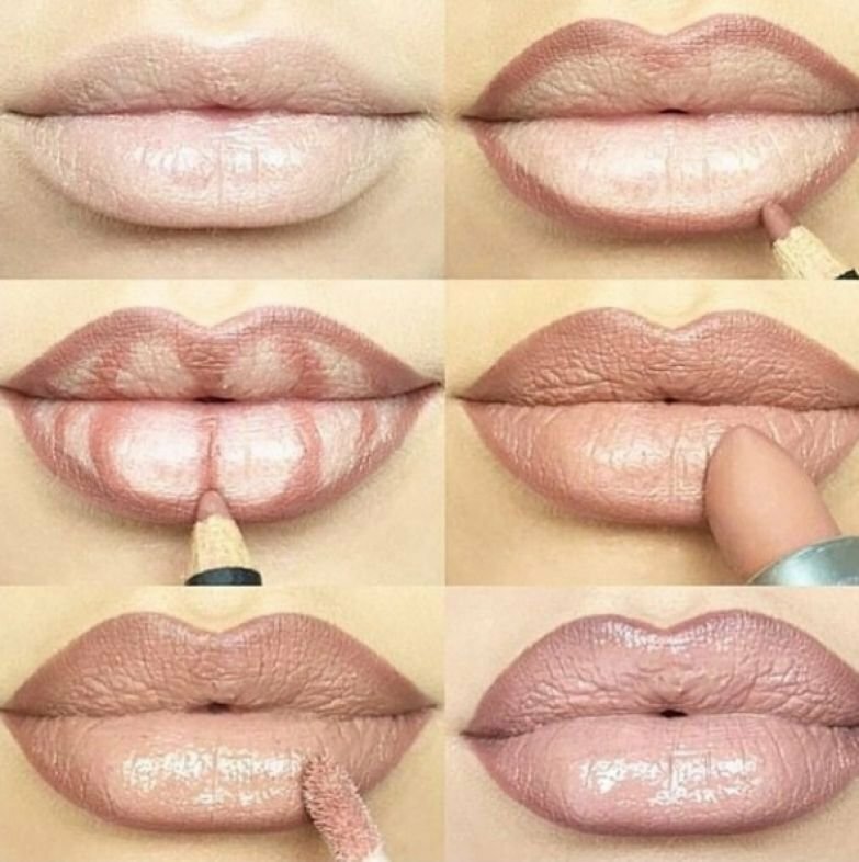 First way. Before using lipstick, you should prepare the skin of the lips. Apply a foundation or concealer to the lips. This will make makeup lasting and even out skin tone. Take a pencil shade darker than lipstick and draw a lip contour. In this case, you can slightly go beyond the borders. With a pencil, we also draw 1 vertical line in the center and 2 on the sides of the upper and lower lips. Apply a brush with a lighter shade so that the drawn lines are barely visible. Apply gloss on top, which will create the effect of volume.