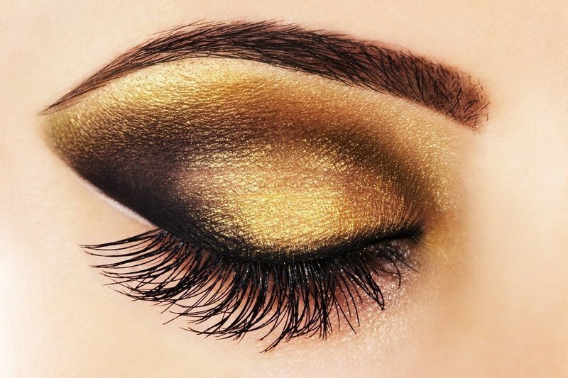 With a thin brush, draw a narrow line along the growth of eyelashes on the lower eyelid, adding a little golden shimmer or glitter on top. Then repeat the contour of the eye with golden shadows.
