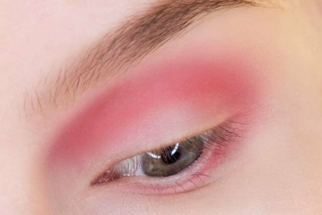 Step 2: add a vibrant accent. From the palette, choose matte shadows with a red or pink undertone. We apply the “loop” in the technique: along the fold of the eye, up onto the fixed eyelid, draw the outer corner.