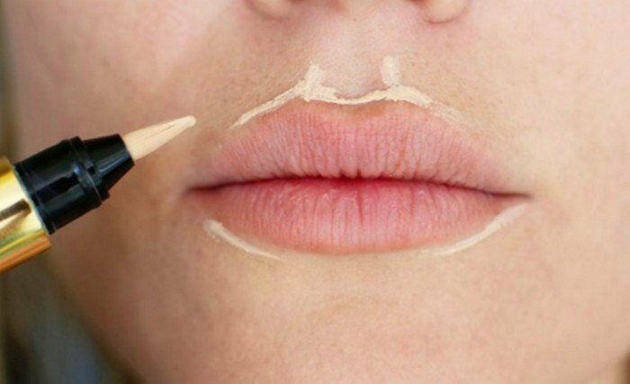 Step 2. Tone the skin around the lips. So that red lipstick does not emphasize dilated capillaries or black dots, apply and blend concealer around the lips.
