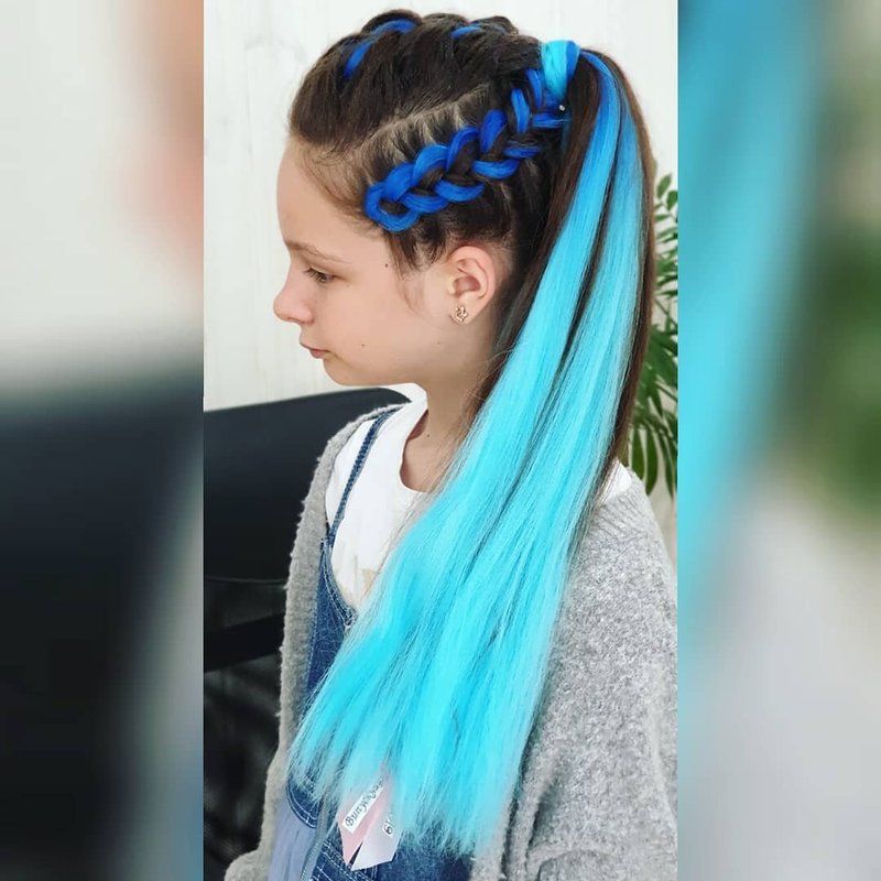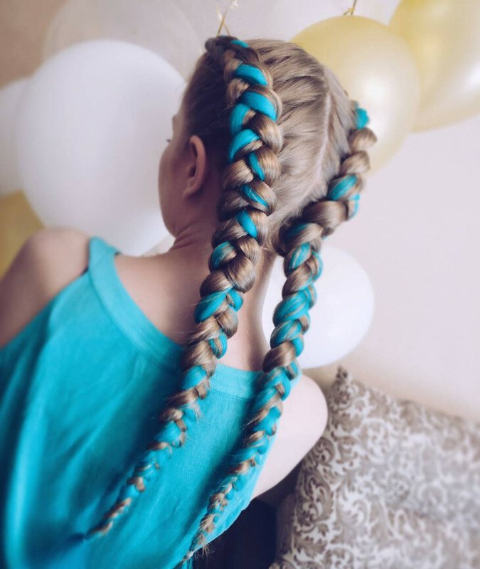 The most popular hairstyle with Kanekalon for children and adolescents - 2 spikelets. You can weave them, both by the classical method, and inside out. Both options look stylish and spectacular.