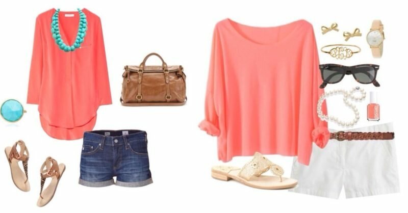 “Live coral” looks beautiful in combination with white and blue colors. Moreover, you can not only combine two different elements of the wardrobe, you can pick up clothes in two colors. Such variations are considered especially fashionable and relevant.