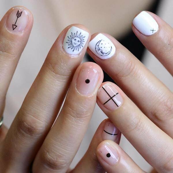 Graphics is one of the leading trends in 2024-2025. Lines, squares, dots, geometric projections and origami, animalism, combined with a classic French jacket or moon manicure, is a great solution.