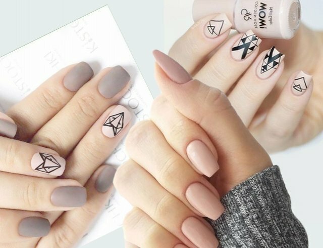 - Decide on the type of nails. For short ones, ultra-thin vertical lines are suitable, for medium and long ones, absolutely all geometric variations, including bright geometry, for wide nails, a dark basic background and geometric compositions with rhombuses and rectangles are needed;