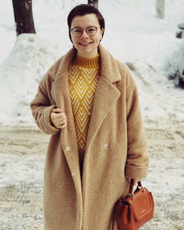 Tatyana’s wardrobe has a lot of coats. The models are different and very stylish, but if the girl combined them with suitable shoes, she would wear hats and at least a little make-up, it would be much better.