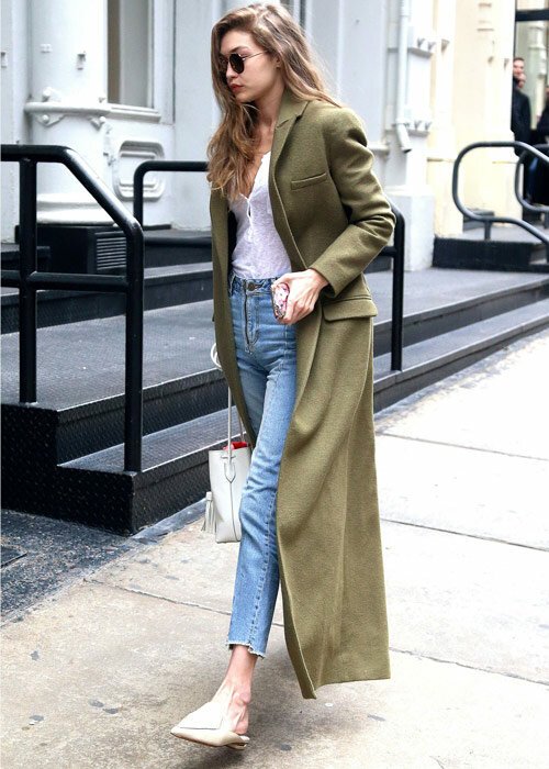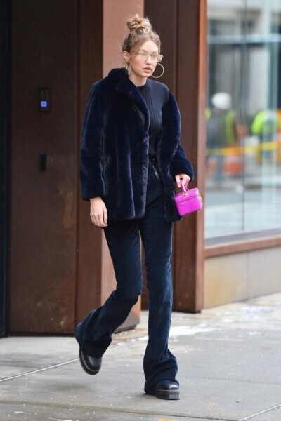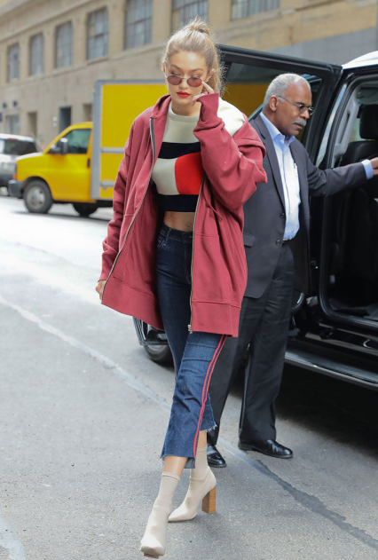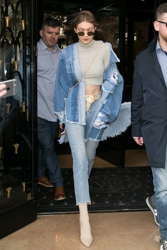 Gigi often walks through the city streets in blue or shade jeans with various additional decorative elements. This can be ankle zippers, contrasting color seams, stripes and appliqués.