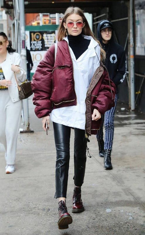 Gigi is also an ardent fan of the sport-chic style, which involves a combination of classic and sporty items. For example, pants and sneakers.