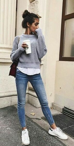 Simple skinny jeans of the same color and high rise are still trending.