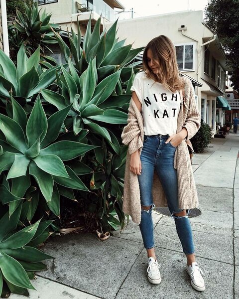 And to give them a modern and fashionable look, stylists offer make holes on your knees and clean the length, since it is unfashionable to tuck or collect jeans with an accordion near the ankle. It is better to shorten them, leaving the edges unprocessed.