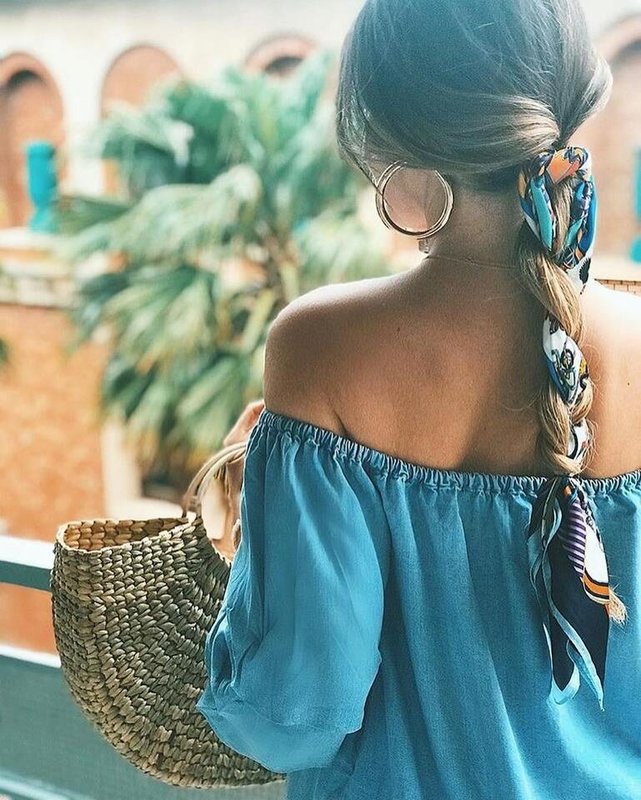 The easiest way to show others that you are following fashion is to tie a scarf on your hair. And there are many ideas. You can make a bunch, tie a scarf on the tail (but not tight!), Create an image in the style of pin-up, weave into a braid.