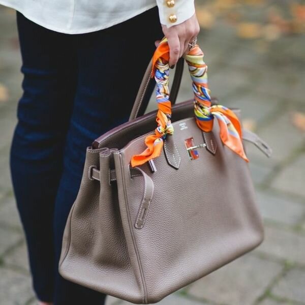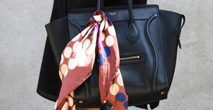 If for some reason you don’t like the scarf in your hair, do not rush to put it in the closet. Tie a fashion accessory with a knot on the handle of a bag. However, it should not match her color.