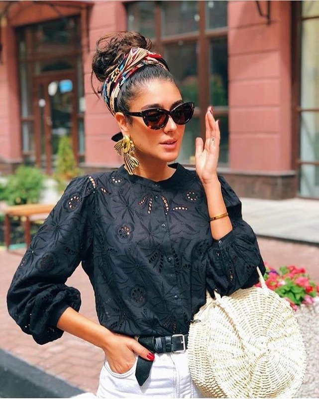 No, it's not old fashioned! A headscarf tied up like a scarf looks stylishly paired with a trench coat or jacket. Wide-rimmed sunglasses fit perfectly into the image. In this case, lips can be painted with a juicy shade of marsala or ripe plum.