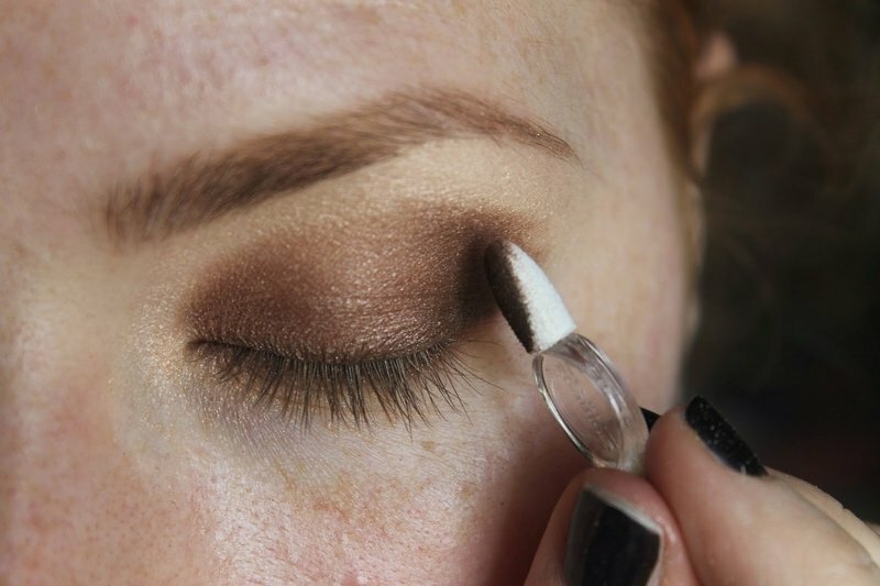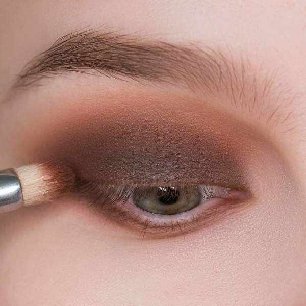 Step 1: the foundation. Choose a base color from the shadow palette, it is preferable to take a brown tint with a slight reddish or orange tint. We apply shadows on the moving eyelid, covering it whole, we also add a thin line to the lower eyelid along the line of eyelash growth.
