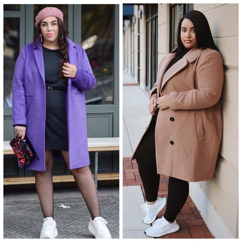 For example, a purple neon coat (left). In autumn, it will look bright, colorful, like autumn itself! Well, a woman will receive attention and compliments, and even forget about her extra pounds.