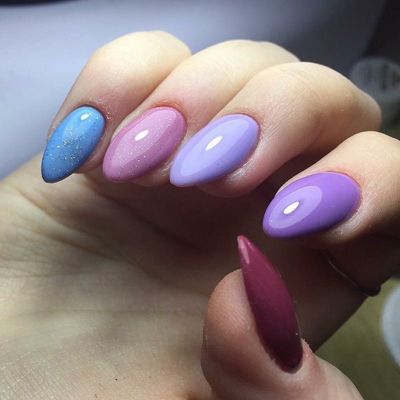 The idea to paint all the nails in different shades of the same color is not new, but very stylish. It is best to cover the thumb with the darkest color and go to the light.