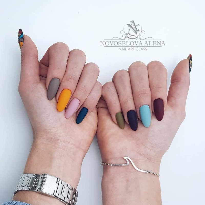 Manicurists assure that such a choice is made by truly charismatic women, open to experimentation. At the same time, we do not mean those who got stuck in 2010 and still asks the master to make kilometer-long nails with rhinestones, lace or floral applications, speaking of colored nails we have in the form of a fashionable solution - different varnishes for all nails.