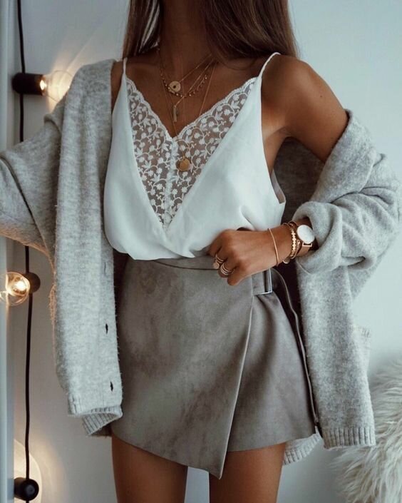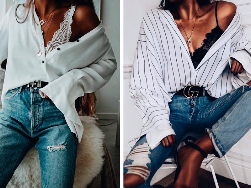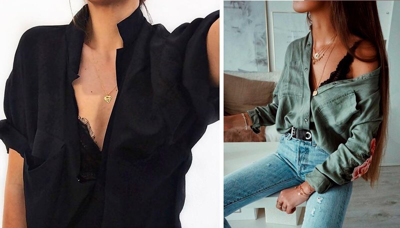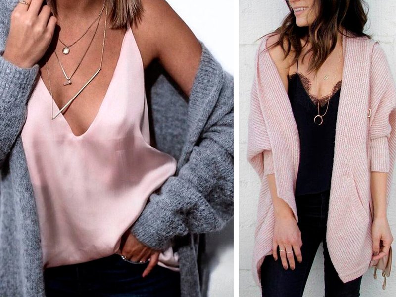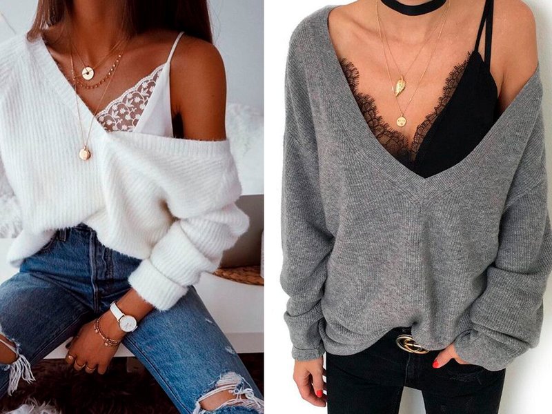 For two years, many were tired of silk tops paired with jackets and cardigans, so the idea came up to combine them with voluminous sweaters. Choose an oversized, deep V-neck knit sweater and put on a sexy lace top underneath. This type of clothing is suitable if you are no more than 30 years old, as otherwise people around you will find the image overly frank.