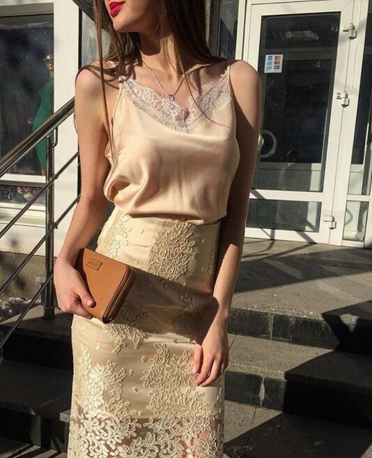 If the event is not so festive, you can replace the lace product or pencil with a more practical one. This season, trendy skirts with a smell of different lengths.