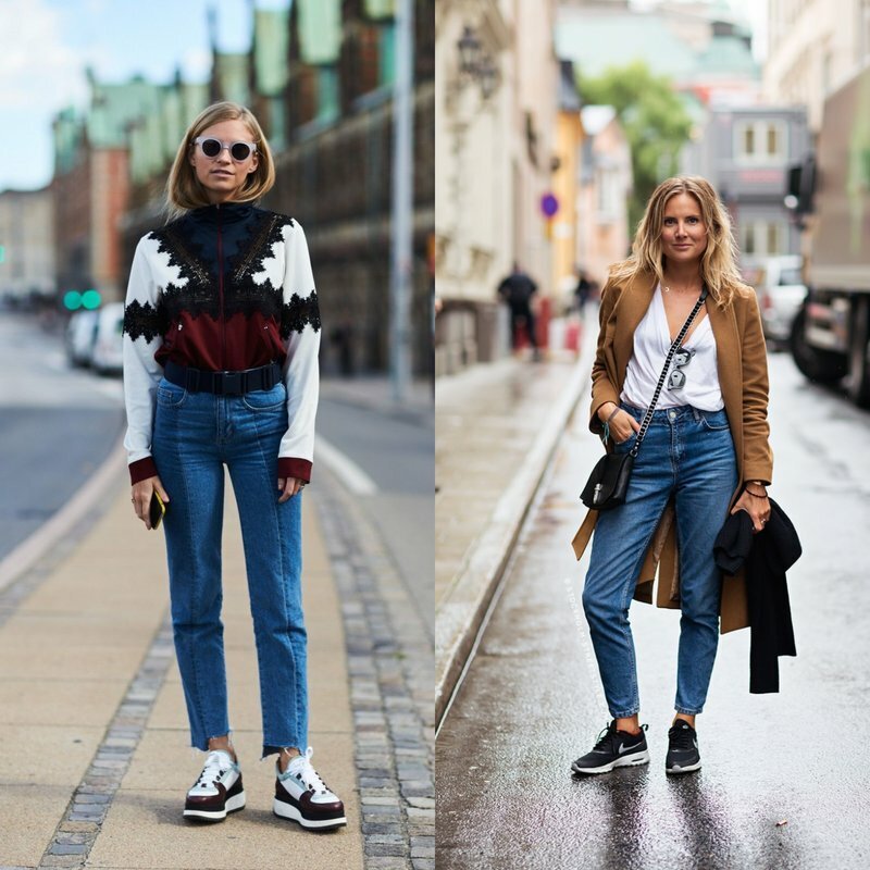 With Mom’s jeans, you can recreate a vintage 80s look. Such jeans will look especially atmospheric with rough shoes and a leather jacket. In this case, you get a daring image under the 90s.