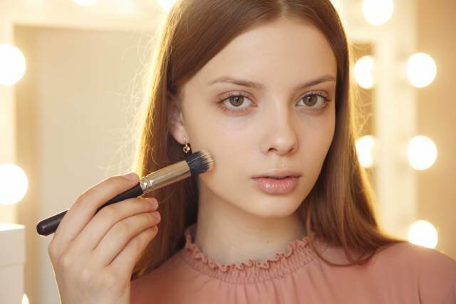 Step 4. Application of blush.They are applied to the cheeks, sides of the forehead and nose bridge. The color of the blush should be refreshing. A highlighter is used to give facial skin radiance.