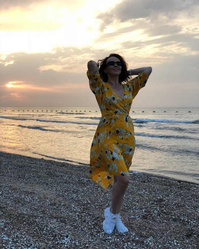 Adult women’s summer dresses should not be extremely short, even if the figure allows you to wear such models. Albina demonstrates how in a light dress with the smell of medium length you can look sophisticated and feminine on the beach.