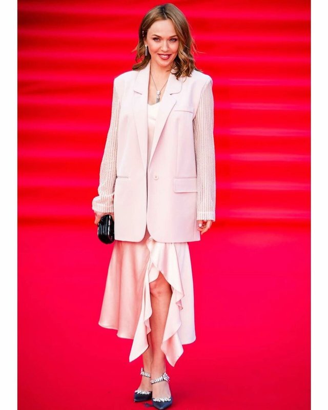 On the red carpet, Janabaeva is always a guest. She looks, as a rule, amazing. For example, a man’s jacket and a light dress are a set that she demonstrated at the Moscow International Film Festival.And at the Cannes Film Festival was in a dress with a deep neckline.