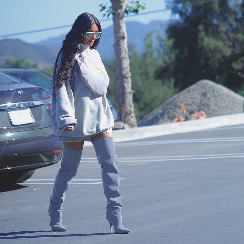 If Kim Chooses a Loose Fit Sweatshirt in order not to lose sexuality, you can not wear pants. Suede over the knee boots will perfectly complete the look. By the way, this style of celebrity was adopted by many of our domestic stars - Natalya Rudova, Lena Temnikova, Olga Buzova.