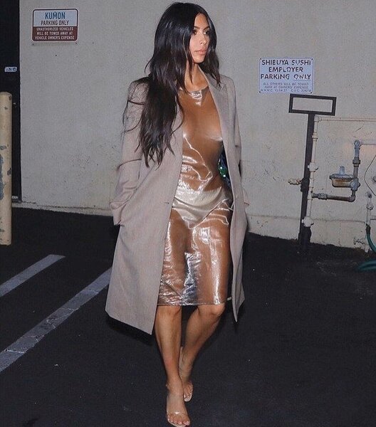 Even Kim's trendy suede trousers look like leggings and perfectly accentuate the shapes.