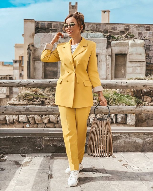 There are several ways to create a stylish bow in yellow. Firstly, you can choose the total look, which assumes a set in one color. A fashionable pantsuit is best suited for this.