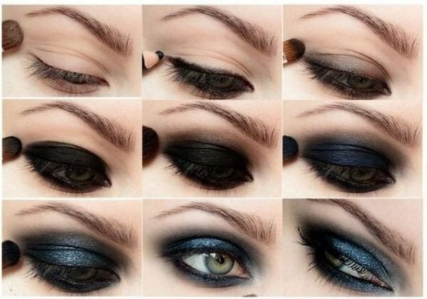 Step 1. Application of shadows.For bright smokey ice, shades such as blue, green, brown are suitable. Shadows are applied to the movable and lower eyelids.